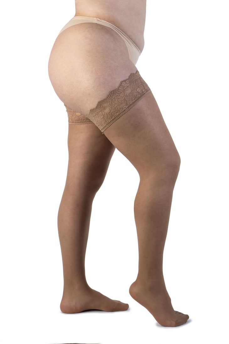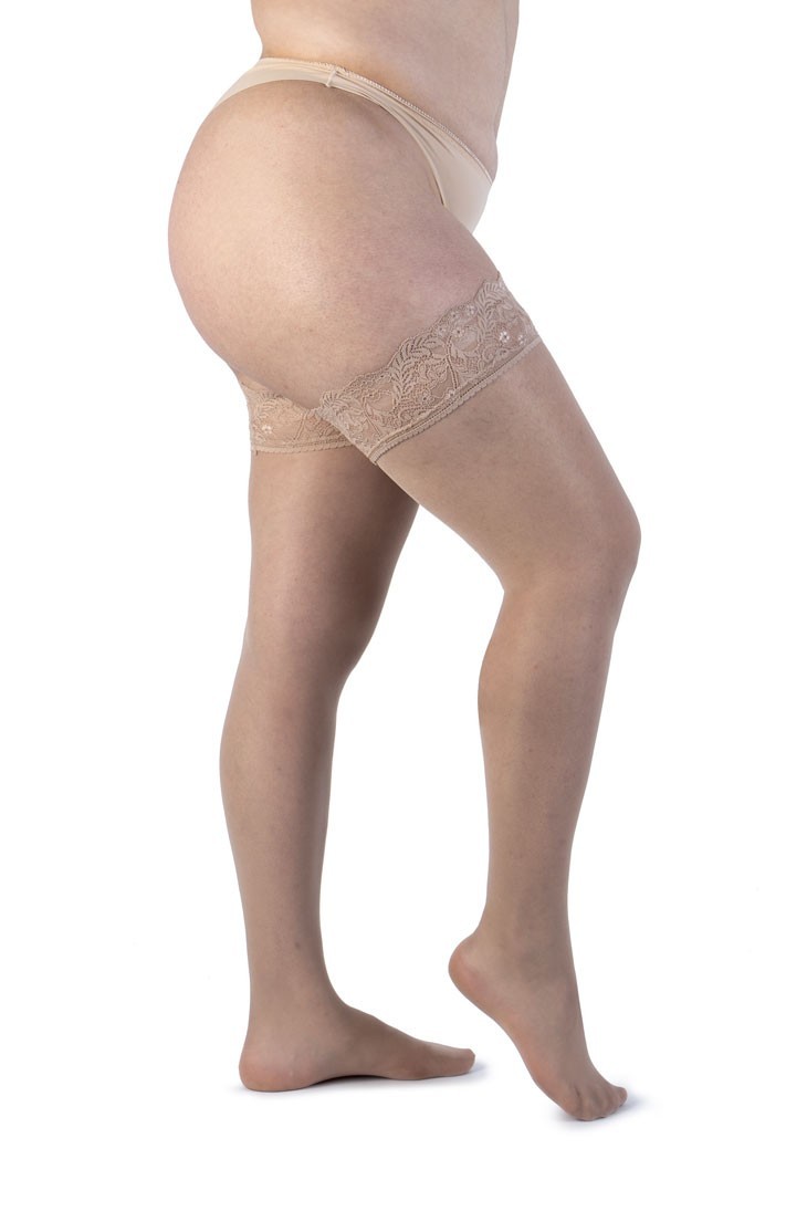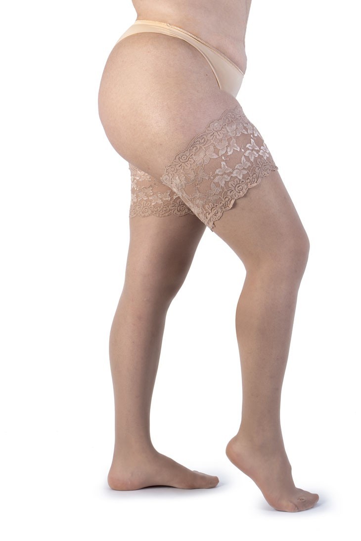 Nach der Mitte des zwanzigsten Jahrhunderts gehen wir vom Strapsgürtel zu halterlosen Strümpfen über: Ihr Hauptmerkmal ist das Vorhandensein eines Volants, der mit Silikon versehen ist. Es schmiegt sich perfekt an das Bein an und geht auch beim Gehen nicht nach unten. Anfangs setzten die Frauen daher bei den Strumpfhaltern eher auf die Stütze des Strapsgürtels (es gab auch solche, die die Strümpfe aufrollten, um handgefertigte halterlose Strümpfe zu erhalten). Die Evolution des Kostüms führte dann zur Geburtsstunde der halterlosen Damen, neuen Accessoires, die sich seit den 1980er Jahren auf dem Markt etabliert haben und einen regelrechten Boom erleben. Sie sind perfekt für alle Größen geeignet, geben Sicherheit beim Gehen und können zu jedem Look getragen werden. Sie haben einen äußerst verführerischen Aspekt und werden von immer mehr Frauen geschätzt. Es gibt verschiedene Arten und insbesondere die kurvigen Strümpfe erfahren eine starke Verbreitung.